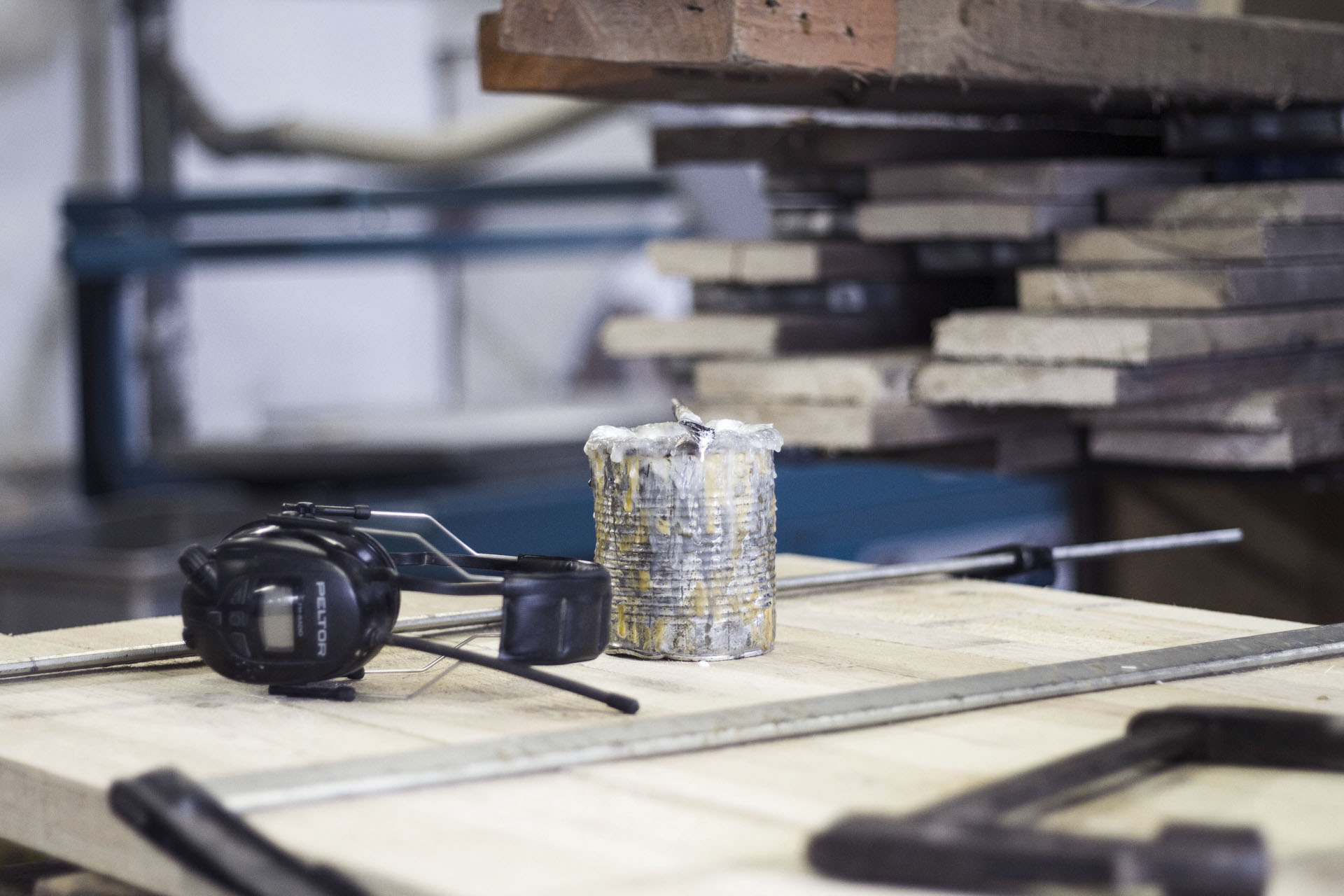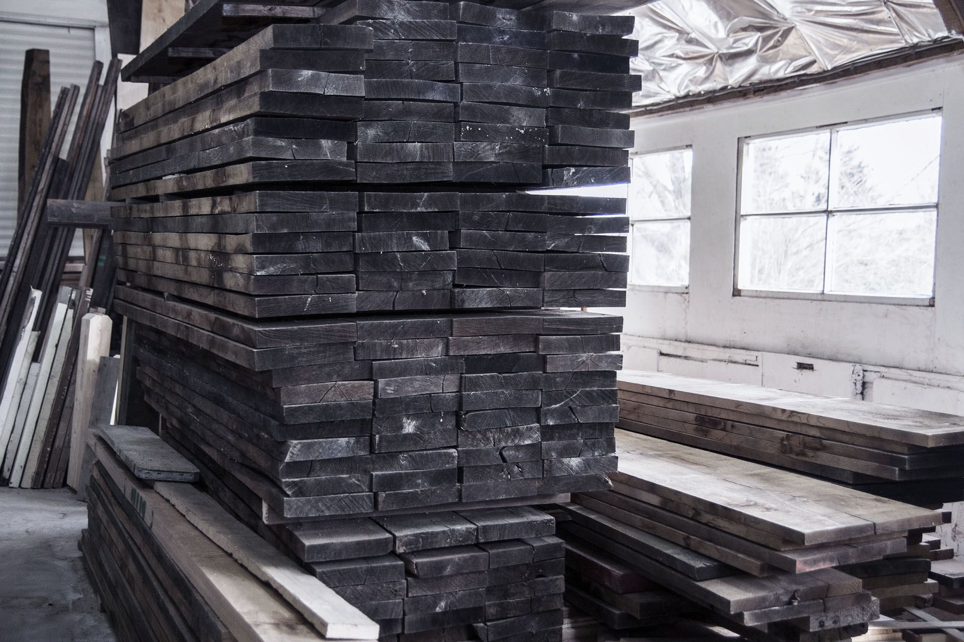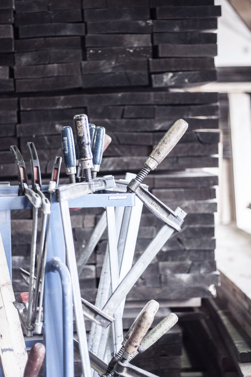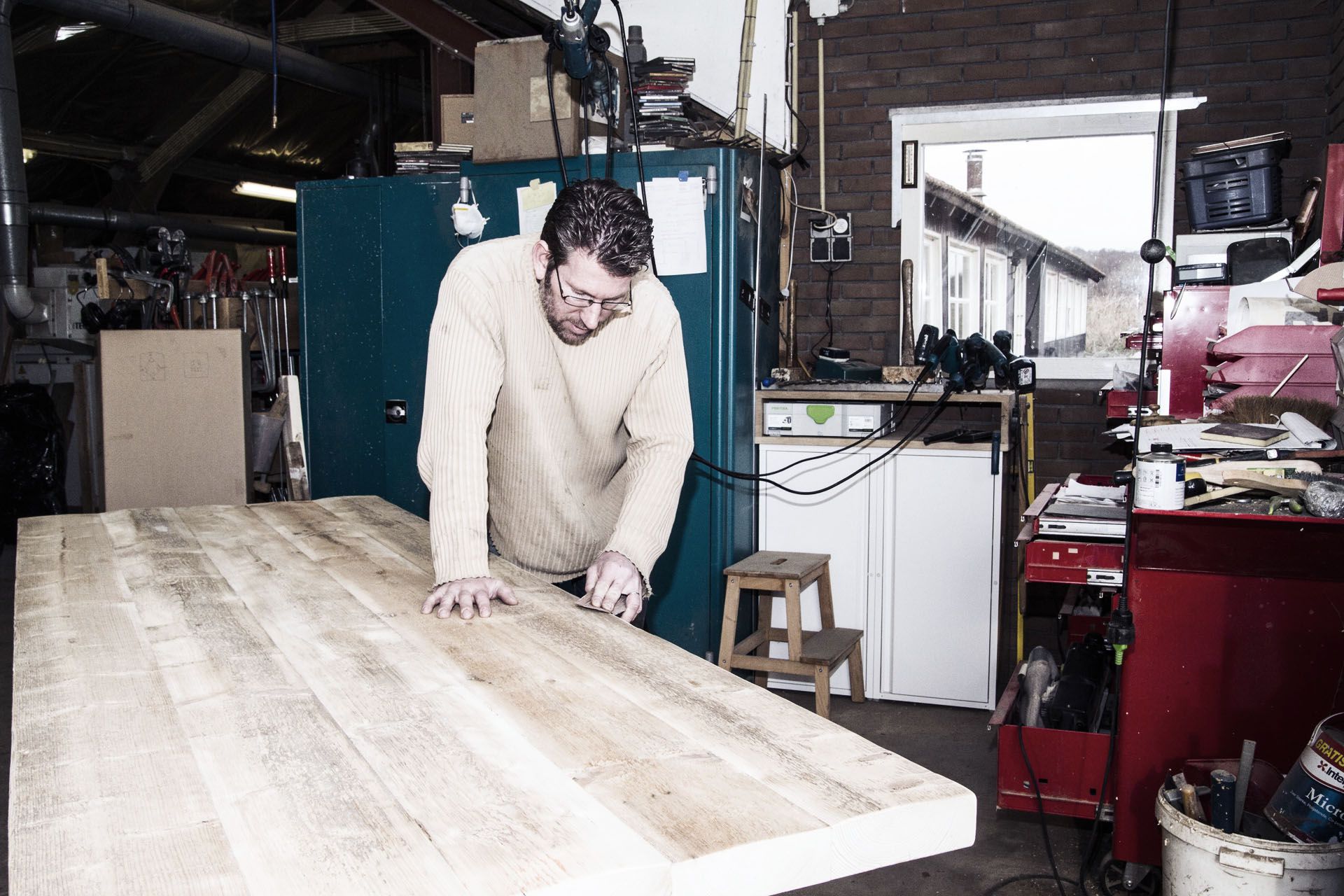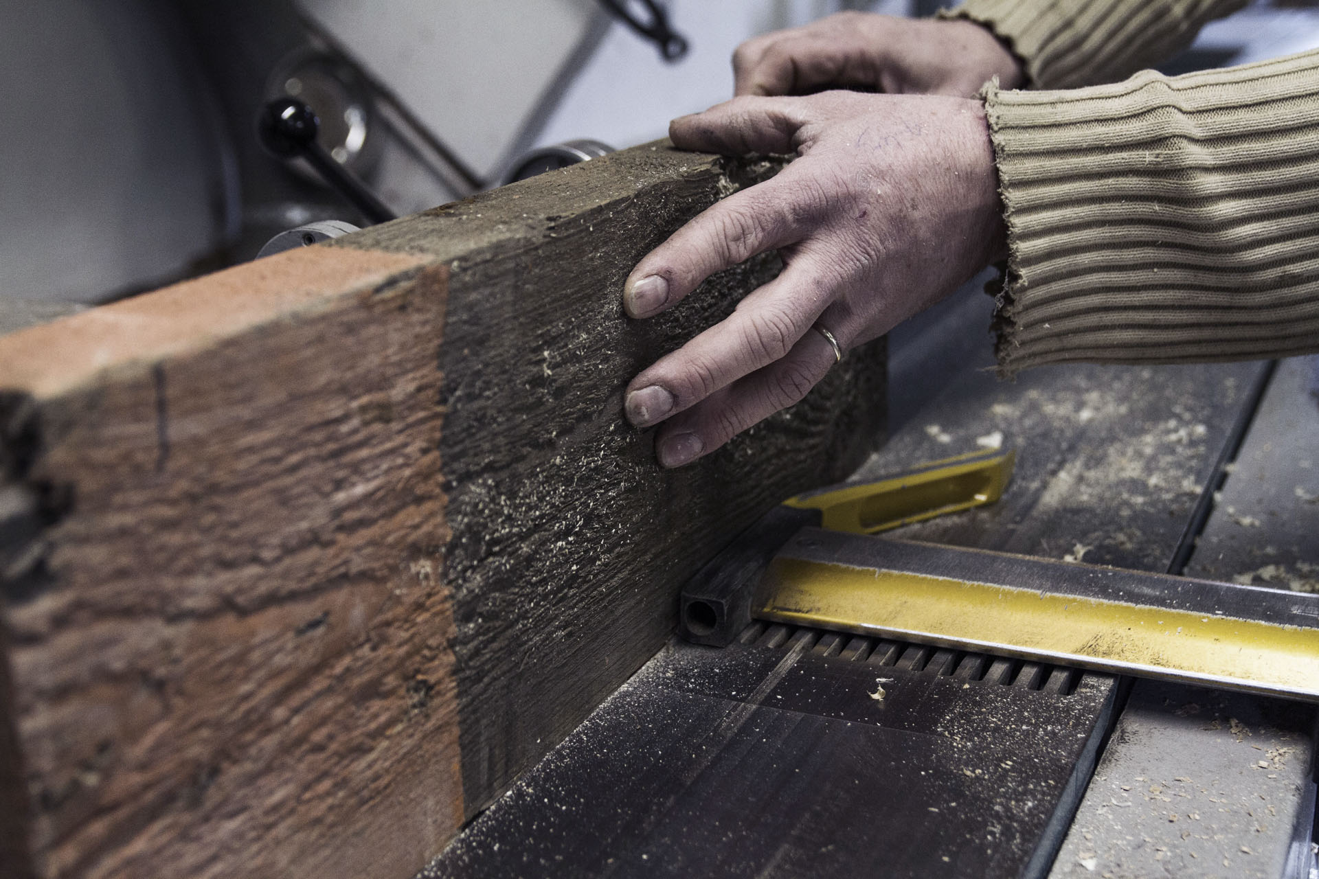 Geen luxe showroom of fancy winkelpand maar een no-nonsense werkplaats, met houtkrullen op de grond en stapels hout in alle soorten en maten, waaruit je ter plaatse kan kiezen.