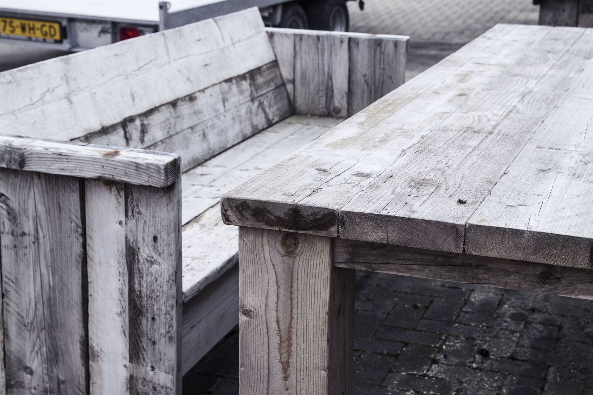 Tuinmeubels worden gemaakt van mooie doorleefde oude steigerplanken of wagonplanken. Deze planken hebben door hun grijze verkleuring een natuurlijke robuuste uitstraling. Tevens is eikenhout, oud en nieuw, uitermate geschikt als houtsoort voor het vervaardigen van tuinmeubels.