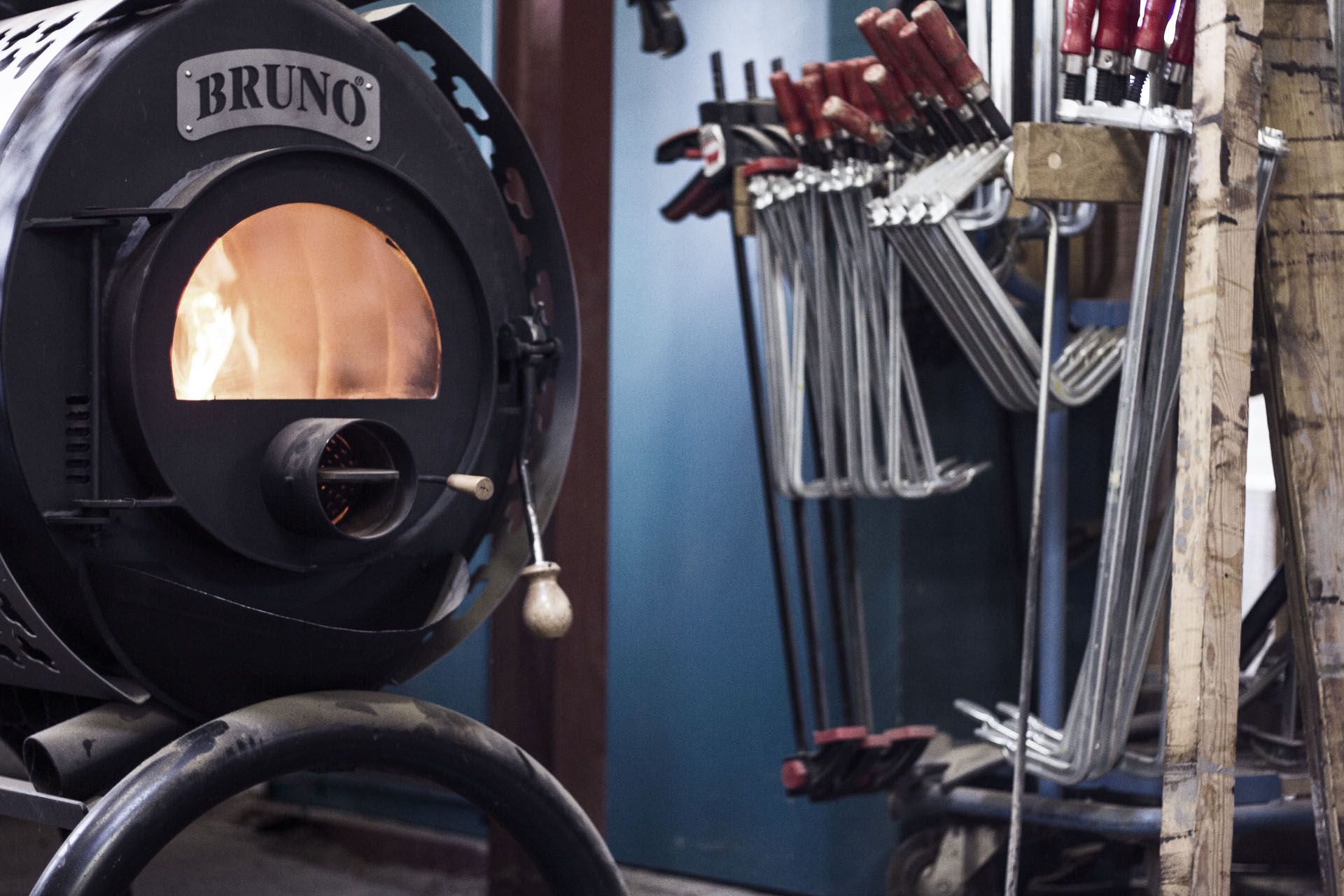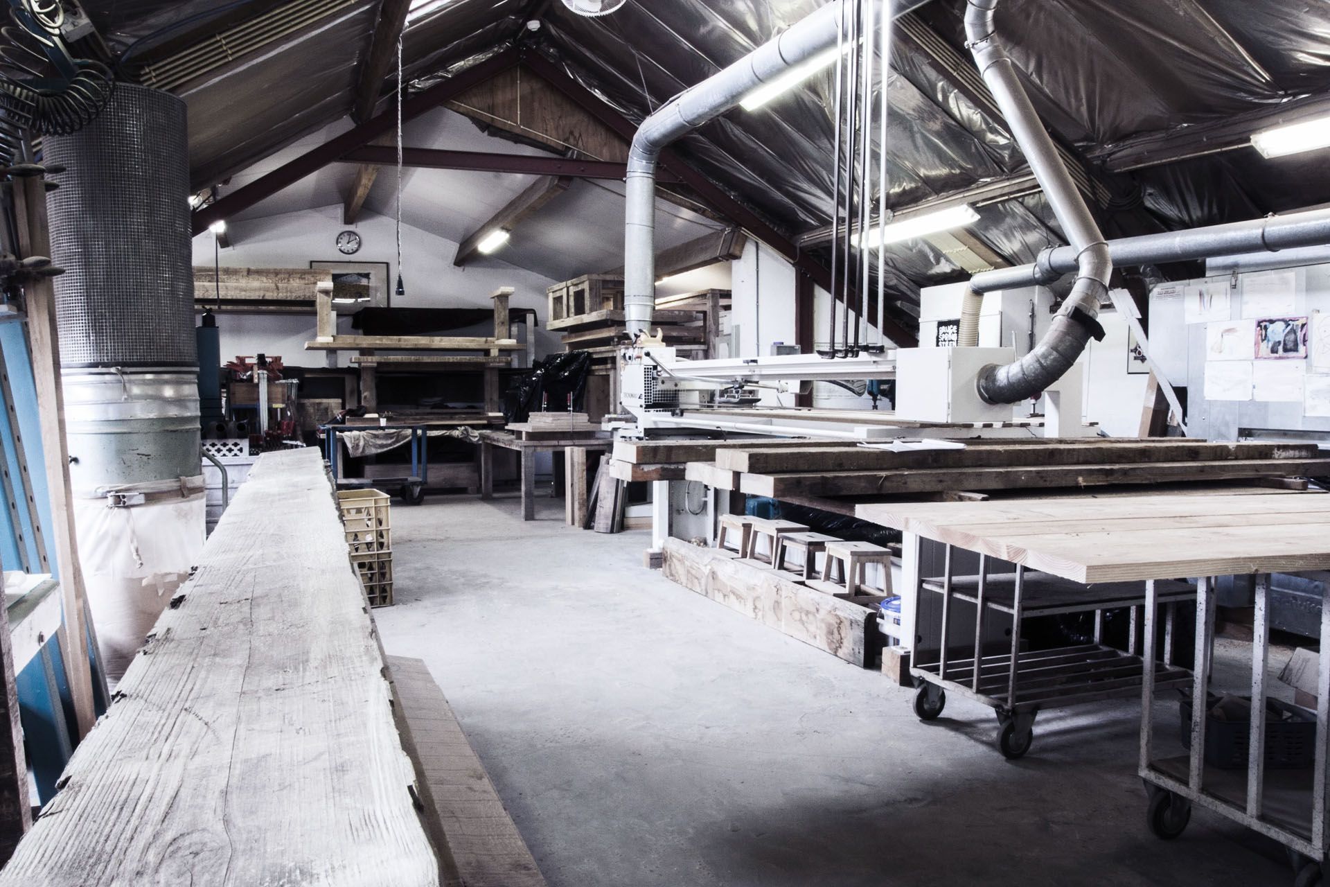 Geen luxe showroom of fancy winkelpand maar een no-nonsense werkplaats, met houtkrullen op de grond en stapels hout in alle soorten en maten, waaruit je ter plaatse kan kiezen.
